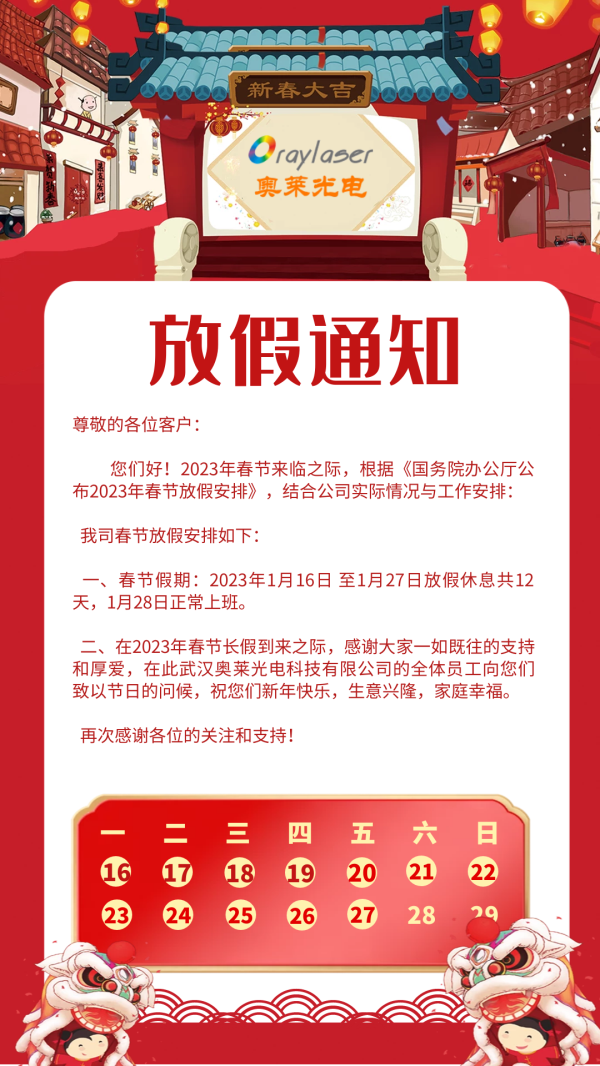 您所在的位置: 首頁 > 新聞中心 > 公司新聞 > 奧萊光電2023年春節放假通知
